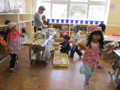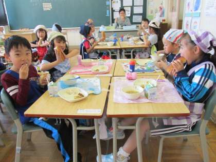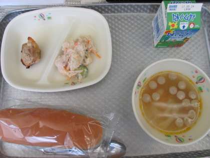 5/18 今日の給食です。今日のメニューは、コッペパン、コンソメスープ、鶏肉のレモンバジル焼き、ポテトツナサラダでした。準備・食事の様子は1年1組です。