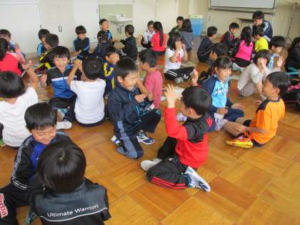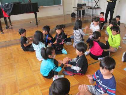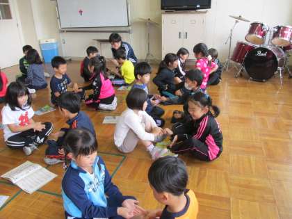 6/16 1年生合同音楽の様子です。『おちゃらか『はみんなできるようになり、『なべなべそこぬけ』が学級全員でもできるようになりました。