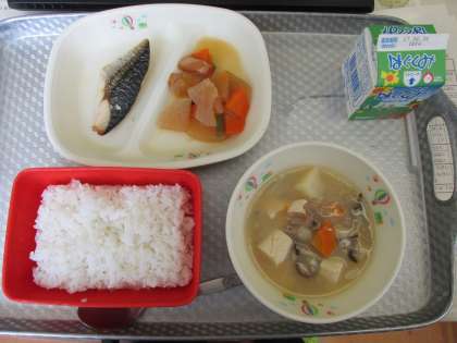 6/20 今日の給食です。今日のメニューは、ご飯、豚汁、鯖の塩焼き、大根の煮物でした。食事の様子は、2年2組です。