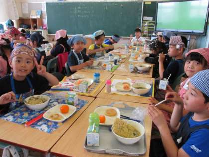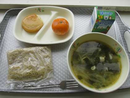 6/21 今日の給食です。今日のメニューは、塩ラーメン、みたらし芋もち、冷凍みかんでした。食事の様子は、3年1組です。