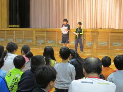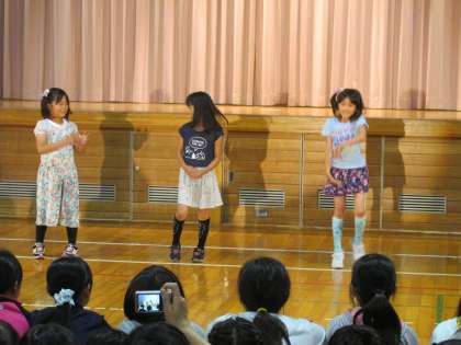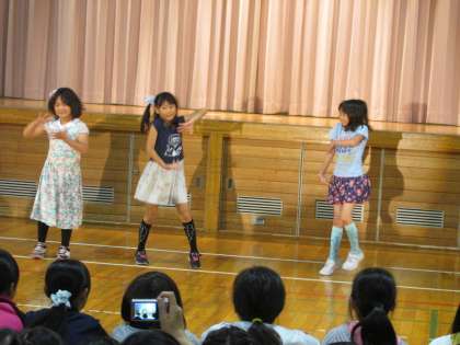 今日は、雨天のため体育館でミニコンサートを行いました。1組目は、ポンポンキャンディの3人組ダンスでした。