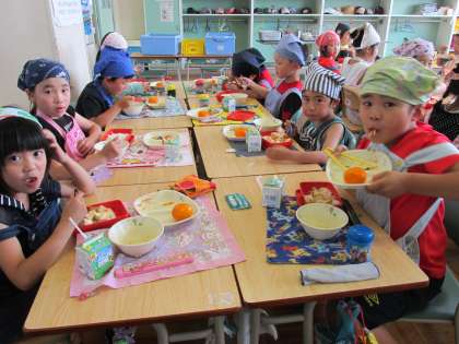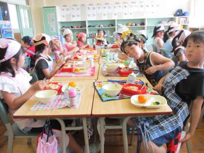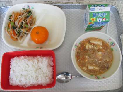 7/07 今日の給食です。今日のメニューは、ご飯、麻婆豆腐、小松菜のナムル、冷凍みかんでした。今季最高気温の今日は、冷凍みかんが大人気でした。食事の様子は、予定変更で2年2組です。月曜日は、順番どおりの1年2組の予定です。