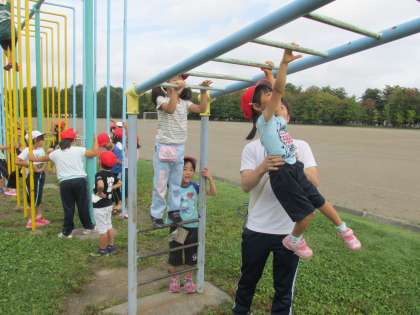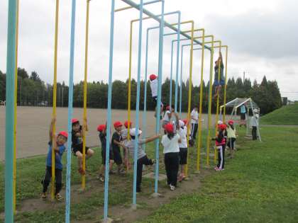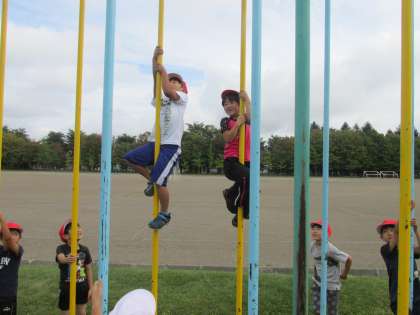 1年生は、体育でうんてい、登り棒、鉄棒、竹馬に挑戦しています。