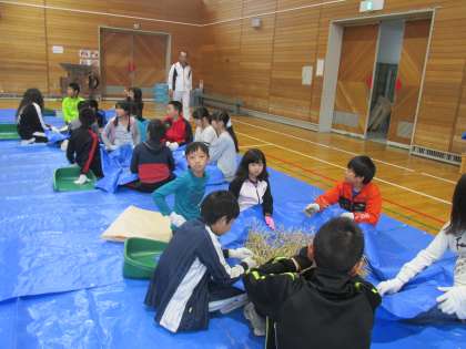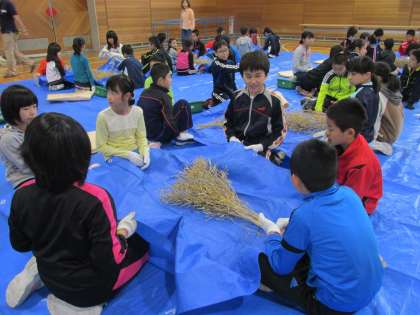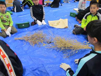 今日はアレフの方に学校に来てもらい、2〜4時間目、体育館で、菜種の脱穀・搾油を学習しました。