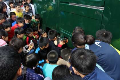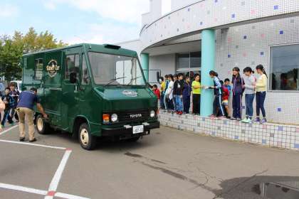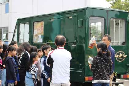 バイオディーゼルのキッチンカーを見て廃油燃料を入れる体験もしました。アレフの皆様、大変ありがとうございました。