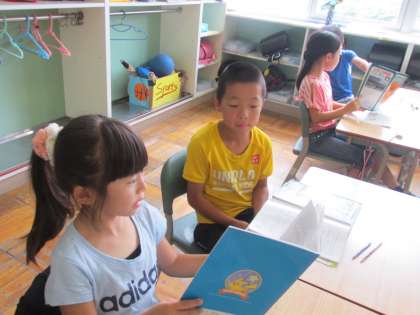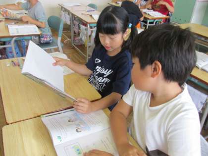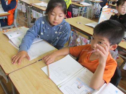 2年生算数の様子です。自分の考えをとなりの友達に伝えるペア学習の様子です。