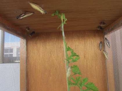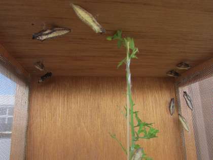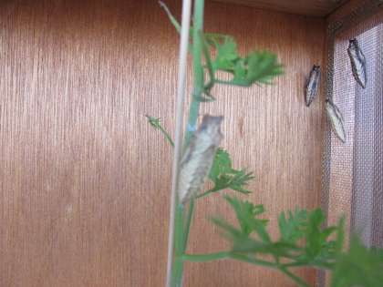 9/15 3年生が飼育していた黄アゲハの幼虫がすべてさなぎになりました。さて、いつ羽化するでしょうか。