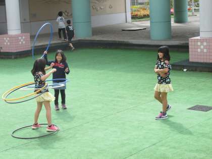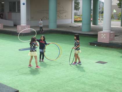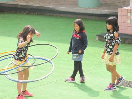 9/20 中休みにピロティーでフラフープを楽しむ子ども達です。2人の服は、たまたまおそろいになったそうです。