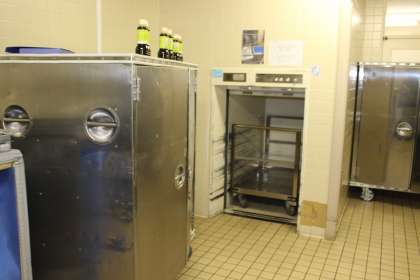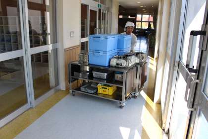 2階に運搬するダムウェーターもあります。画像では2台ですが給食台3台同時押しの技も使ってスピーディーな配膳をしてくださっています。