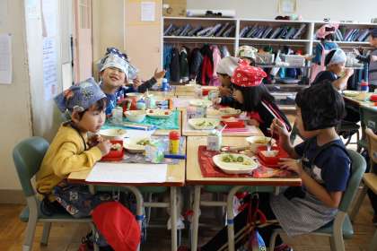 今日のメニューは、麦ご飯、ハヤシライス、グリーンサラダ、ミニトマトでした。食事の様子は、1年3組です。