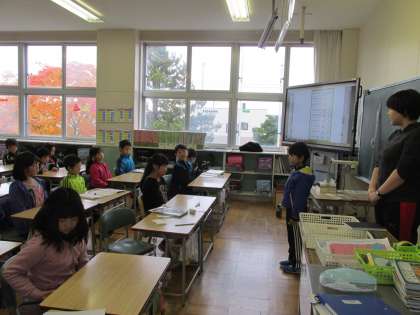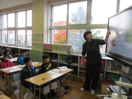 2年生の算数《かけ算》の様子です。電子黒板&紅葉を見ながらの学習です。