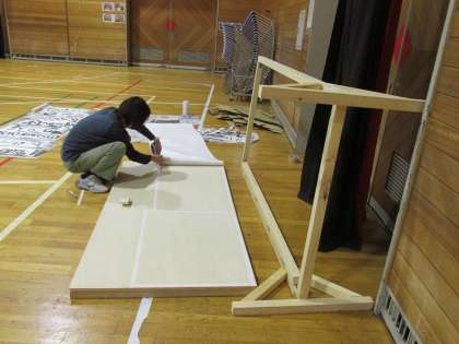夜な夜な、体育館や教室で学芸発表会に向けて大道具やバック絵をつくっています。