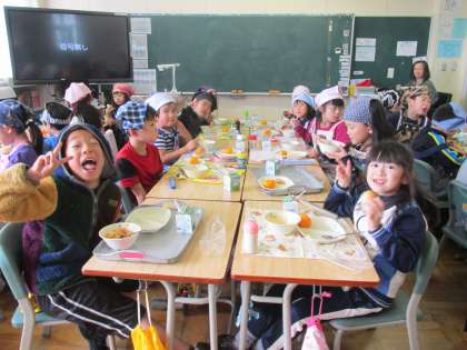 今日のメニューは、背割りコッペパン、ポークビーンズ、マカロニツナサラダ、みかんでした。食事の様子は、2年2組です。