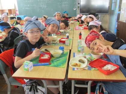 今日のメニューは、麦ご飯、大根と油揚げの味噌汁、さんまのカレー煮、肉じゃがでした。食事の様子は、3年1組です。