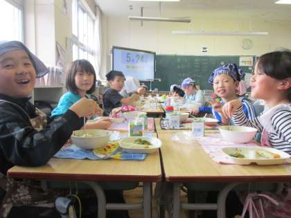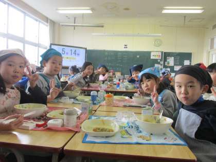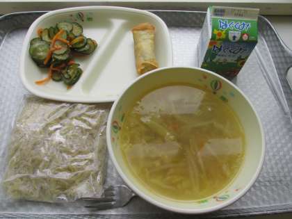 今日のメニューは、野菜塩ラーメン、ひじき春巻き、きゅうりとくらげのごま酢和えでした。食事の様子は、3年2組です。