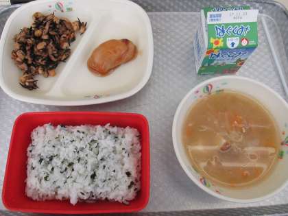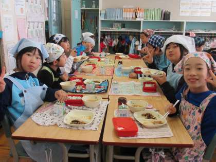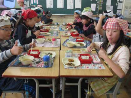 今日のメニューは、わかめご飯、厚揚げの味噌汁、鶏の照り焼き、大豆とひじきの炒め煮でした。食事の様子は、4年2組です。