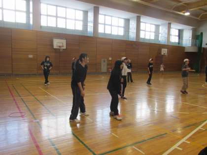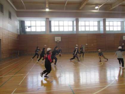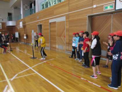 11/20 6年生の体育、ティーボールの様子です。アシスタントティーチャーさんも一緒にプレー。