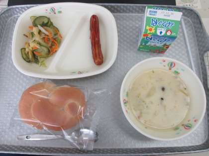 今日のメニューは、ホワイトロールパン、白菜のクリーム煮、ウインナーケチャップ、茎わかめのサラダでした。