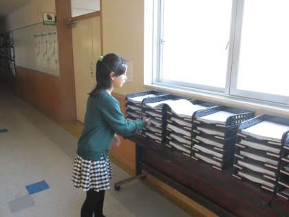 火曜日の朝学習は計算検定です。プリント問題コーナーから計算プリントを持ってきて、教室で取り組みます。