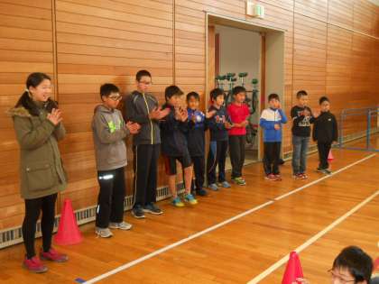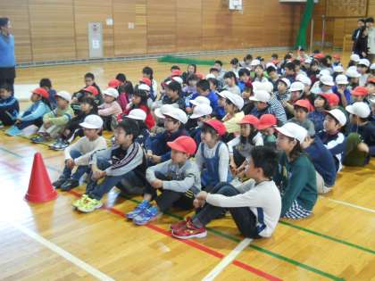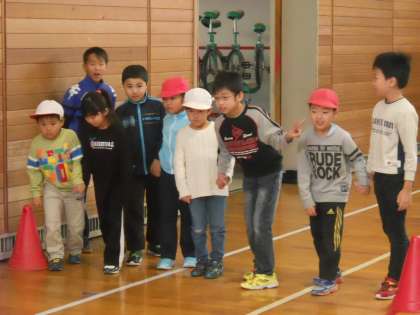 中休みに書記局と体育委員会が共催する異学年交流企画、スマイルタイムが行われました。2年生と5年生が力を合わせて障害物競走にチャレンジです。
