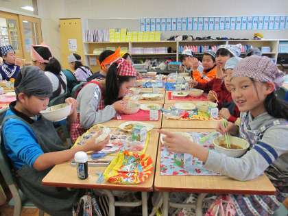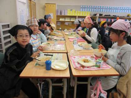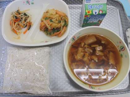 今日のメニューは、五目うどん、野菜かき揚げ、もやしの和え物でした。食事の様子は、5年2組です。