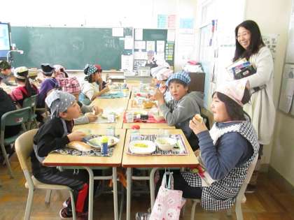 今日のメニューは、コッペパン、サーモンチャウダー、ウインナー焼き、コーンソテーでした。食事の様子は、4年1組です。