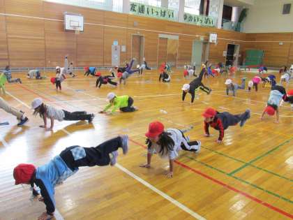 縄跳びの後は、準備運動。腕立てジャンケンもできるようになりました。