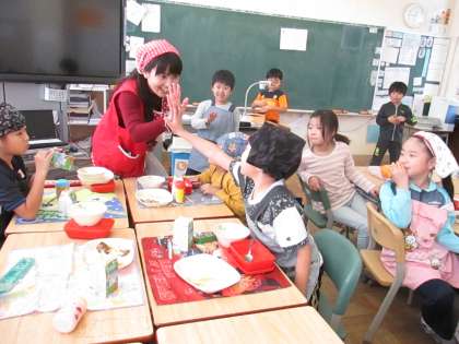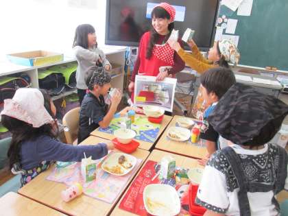 山崎先生は、6年生の食指導の後、給食時間に1年生の教室に来てくださいました。