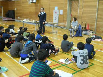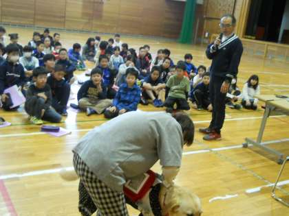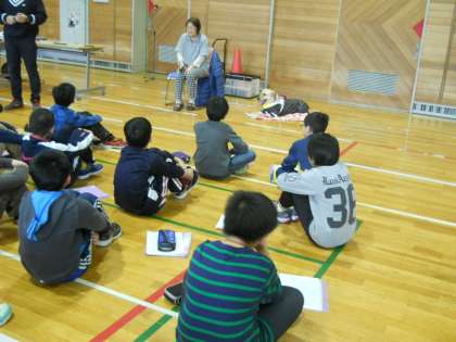 5年生が総合的な学習の時間に取り組んでいる福祉学習の一環として、恵庭視覚障がい者フロンティア協会の会長さんと盲導犬ドナ号を講師に迎えて、視覚障がいや盲導犬について詳しく学びました。