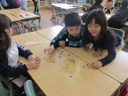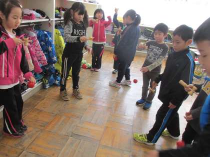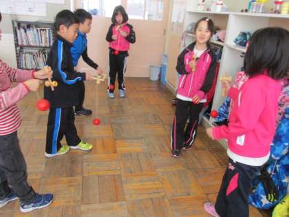 1組は、めんこ。2組は、おはじきとけん玉。3組は、あやとりをしていました。