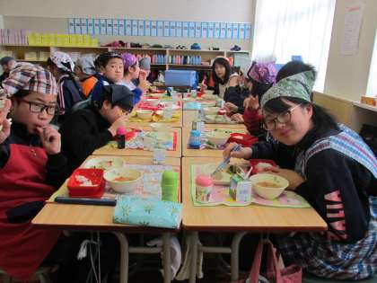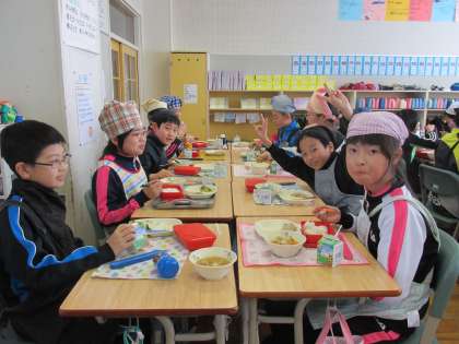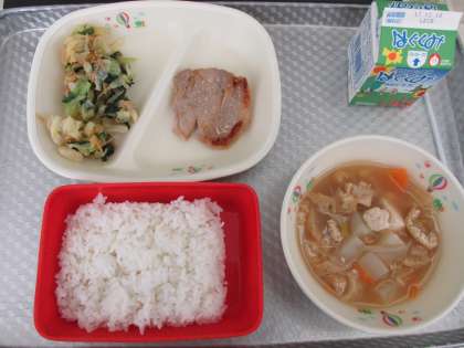 今日のメニューは、ご飯、けんちん汁、豚肉のしょうが焼き、なめたけ和えでした。食事の様子は、5年2組です。