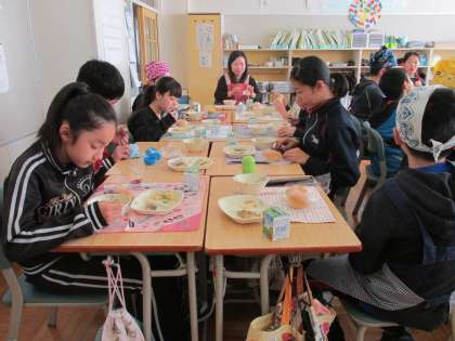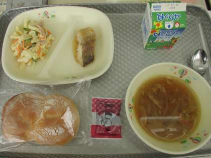 今日のメニューは、ソフトフランスパン、オニオンスープ、鱈の甘酢ソースかけ、マカロニサラダ、大豆チョコクリームでした。食事の様子は、6年2組です。