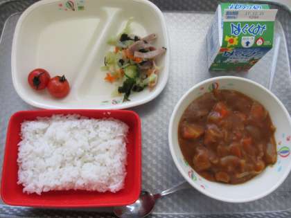 昨日のメニューは、ご飯、ミートボールカレー、わかめとキャベツのサラダ、ミニトマトでした。食事の様子は、あさひ学級です。