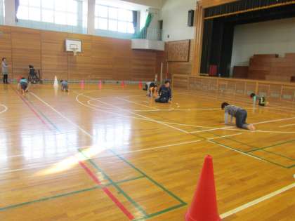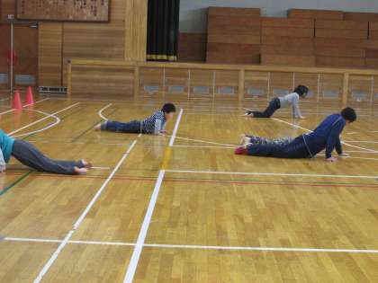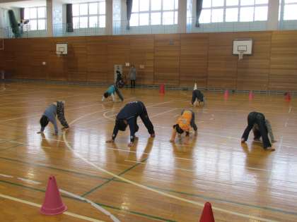 12/18 あさひ学級の音楽リトミックの様子です。体育館で音楽に合わせて身体を動かしているところです。
