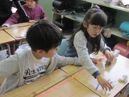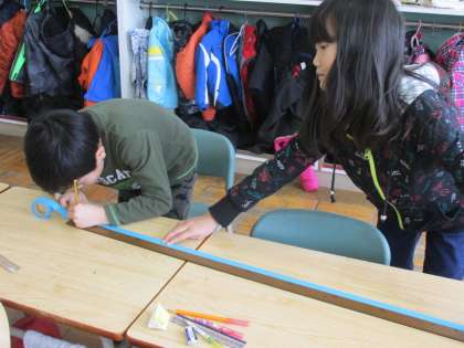 2年生の算数《長さ》の学習の様子です。1m=100cmをしっかり学びました。
