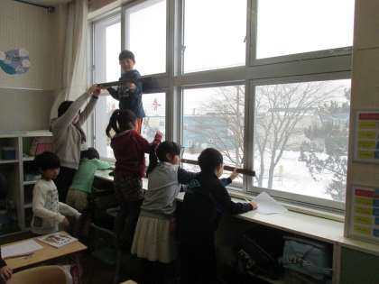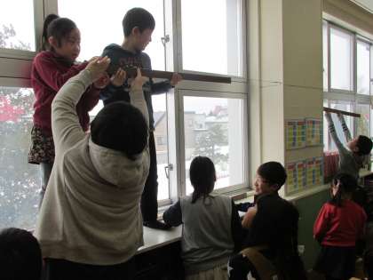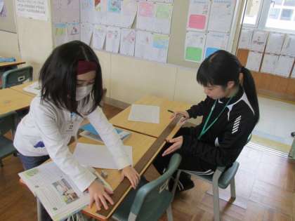 2人で協力して長さをはかっていました。