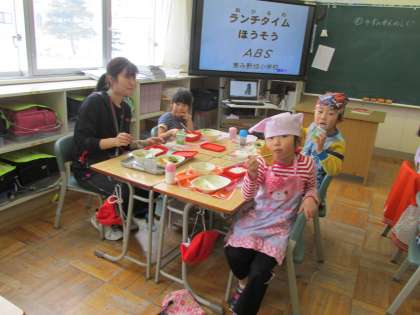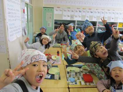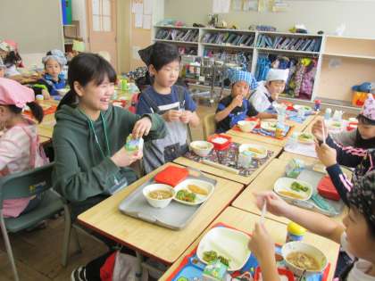 1・2・3年の各学級にインターンさんが入って3日間研修します。初日の給食の様子です。