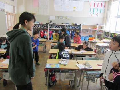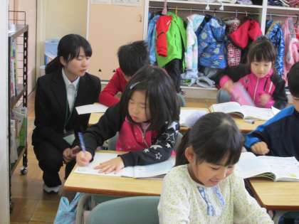 本日より3日間、北海道文教大学の4年生7名がインターンシップ(ミニ教育実習・職場体験)を行います。1・2・3年生の各クラスに1名ずつ入ってもらいました。1年生に配属した2名の学生さんは、昨年度のアシスタントティーチャーさんです。