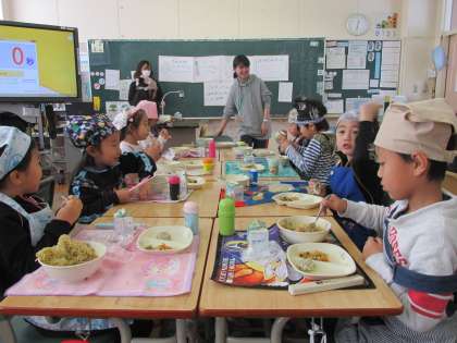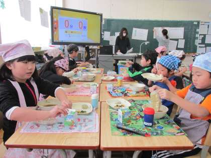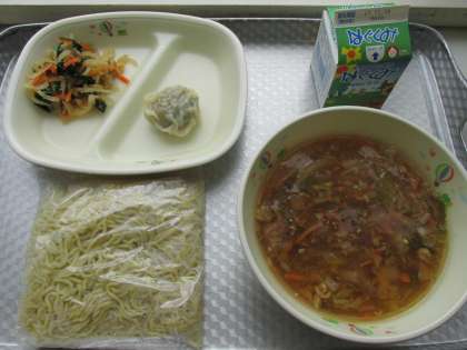 今日のメニューは、チンジャオ焼きそば、ニラまんじゅう、大根のナムルでした。1年3組の子ども達は、「つかれをとるためにニラからたーべよ!!」「びょうきにならないようにだいこんたべよーー」といいながら、いつもより、もりもり食べていました。