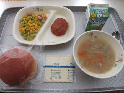 今日のメニューは、バンズパン、芋もちスープ、ハンバーグケチャップソース、コーンソテー、スライスチーズでした。