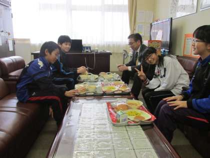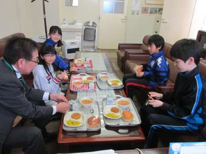 学校長と6年1組児童の会食交流の様子です。今日のメニューは、バンズパン、ミネストローネスープ、メンチカツ、コーンソテーでした。