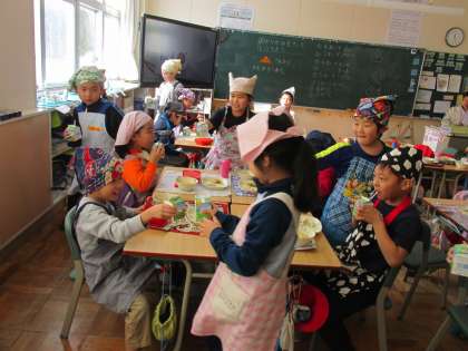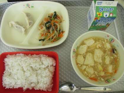 今日のメニューは、麦ご飯、四川豆腐、蒸し餃子、三色和えでした。食事の様子は、1年1組で、誕生祝いの牛乳乾杯をしていました。