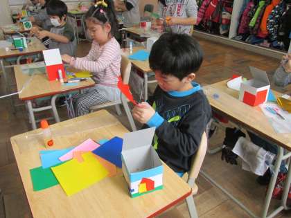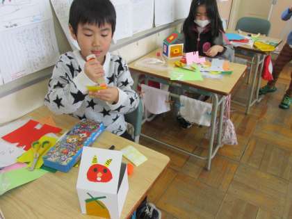 折り紙を使って、箱をきれいに飾っています。また、図工でも電子黒板は活躍しています。