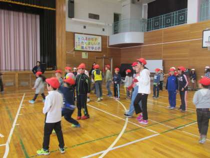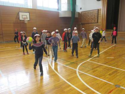 2年生と4年生がチームになって協力してドッジボビーをしました。
