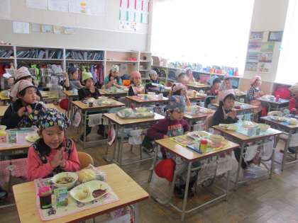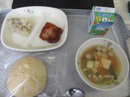 今日のメニューは、メロンパン、コンソメスープ、ポークチャップ、ジャーマンポテトでした。