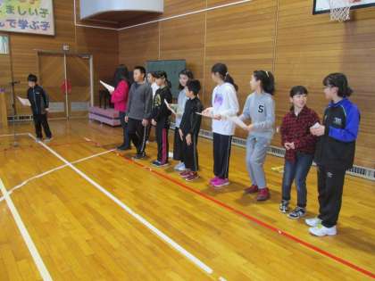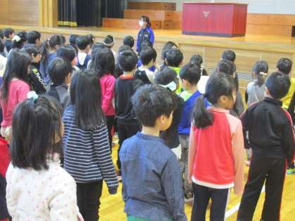 今朝、児童朝会を行い、新児童会役員の認証式と「どさん子元気アップチャレンジ」短縄跳び全道大会(2期 家庭・地域部門)の表彰式を行いました。