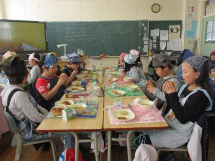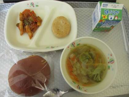 今日のメニューは、黒糖パン、野菜スープ、豆腐ハンバーグ甘酢ソースがけ、ペンネポロネーゼでした。食事の様子は、2年2組です。
