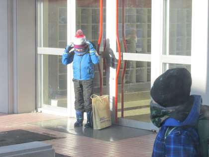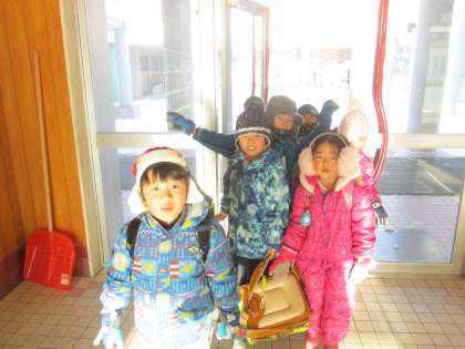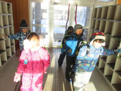 連日、マイナス15度以下の厳寒の中、元気に登校してくれる子ども達が玄関に入ってくる、厳寒玄関の様子です。