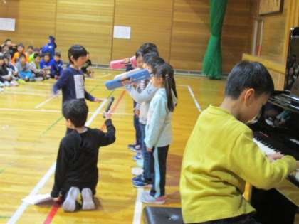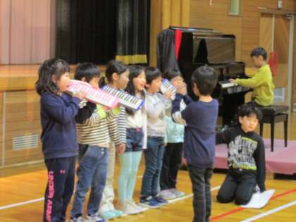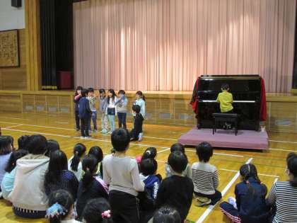 今年度第4回目のミニコンサート3日目の様子です。1組目は、《1年3組ひのまるがっしょうだん》の歌と演奏でした。