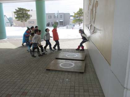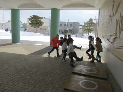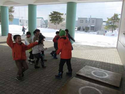 昼休みにピロティーで花いちもんめをしていた仲良し3年生。